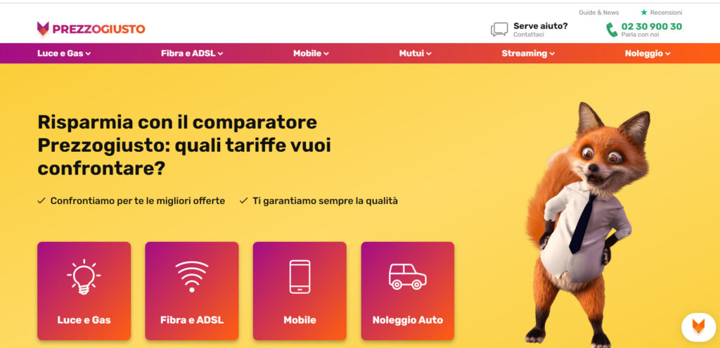 Prezzogiusto è il comparatore di prezzi online che aiuta nella scelta e mira a far raggiungere un rapporto qualità/prezzo ottimale. Prezzogiusto offre un servizio di comparazione di tariffe su luce e gas, internet casa, mutui, streaming e noleggio, aiutando il cliente a scegliere la migliore offerta sul mercato, mettendo al primo posto la soddisfazione dei suoi clienti.